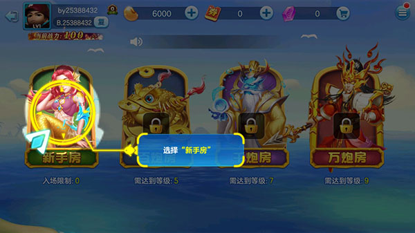 3、选择房间,此时我们跟着指引教程点击新手房即可