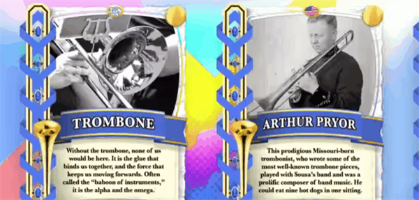长号冠军手机版拥有超过20首曲目,其中包括进行曲、国歌、蓝调、经典、民谣、有趣歌曲等,掌握从合集到S级的每一首歌曲,玩家将成为真正的音乐冠军。游戏还为冠军、长号、萨克斯管等乐器设计了不同皮肤,玩家可在游戏中尽情收集。成为冠军,在我们的游戏中释放您的长号英雄!