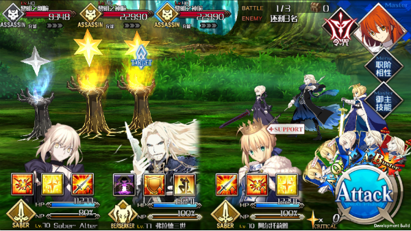 右上角:这部分的按钮则是用于使用令咒、查看各个职介的相性以及使用Master技能来辅助战斗的按钮,需要注意的是令咒是以天为单位进行恢复的,而Master技能则是在一个副本中以回合为单位进行冷却,因此玩家在这次副本中进入冷却的Master技能不会影响到下一个副本的战斗。