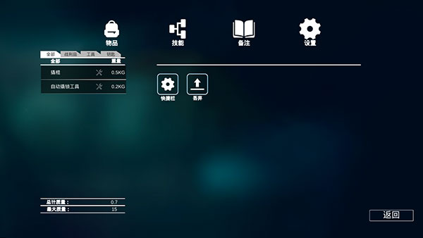 7、点开右上角的齿轮图标,首先看到的就是物品栏,我们可以将物品设置为快捷栏使用或者丢弃,需要注意的是,物品背包是有重量上限的。