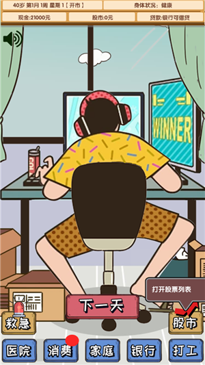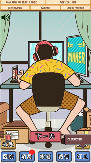 游戏的操作也很简单,新手指南一步步指引,从买电脑到打工再到炒股,流程清晰明了。每天完成任务还能提升资金,扩大股票规模,这种成就感挺吸引人的。总的来说,这款游戏让我在虚拟世界中体验到了现实生活中的酸甜苦辣,非常值得一玩。