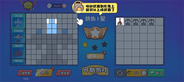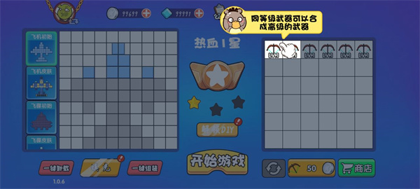 游戏的操作也十分的简单,玩法和球球大作战类似,但该游戏不能分裂,该游戏只能通过不断吸收足够的方块,使得你小飞机变得更加的大,到了一定程度后还会出现一个新的皮肤形状,让玩家的小飞机更加的炫酷。游戏在开始还需要做准备,玩家需要购买武器,如果武器等级相同还可以进行合成升级,再将合成的武器装备到形象方块上,等准备做好后玩家就可以点击开始游戏进行游玩啦!还在等什么,有兴趣的玩家快来下载方块吞噬进化游戏游玩吧!