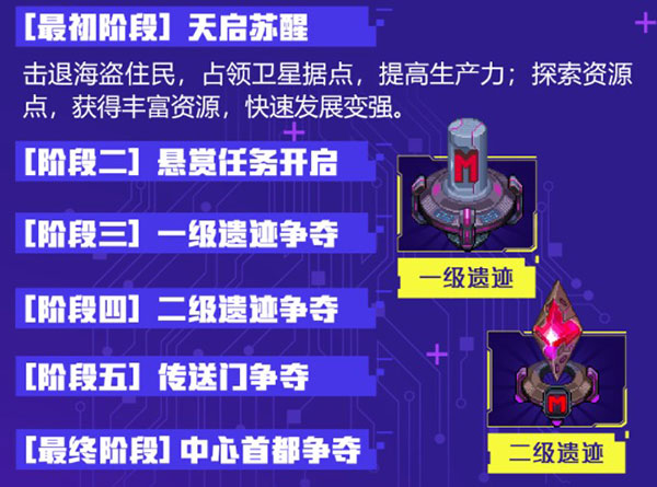 通过【星巡大事】解锁,贯穿整个服务器主进程任务,每达成一件星巡大事,全服冒险家皆可领取对应奖励;星巡大事分为六大阶段:天启苏醒、悬赏任务开启、一级遗迹争夺、二级遗迹争夺、传送门争夺、中心首都争夺称霸;