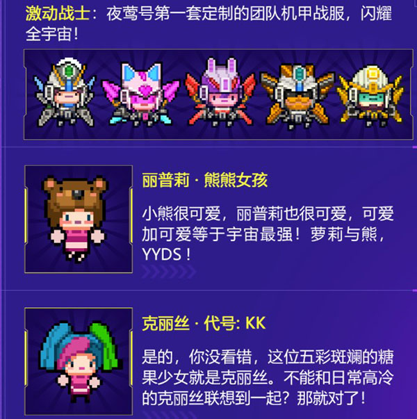 星巡守卫队官方版是由星巡制作组制作的一款以未来宇宙为背景的像素动作射击RPG手游,穿梭未来宇宙,体验别样的冒险乐趣。游戏在美术画风上,采用了经典的像素画风,独特的渲染系统,力求以视觉的方式,为玩家呈现夜莺号舰桥、空间站、行星地图等一系列未来场景,以及翻滚、射击、随机彩蛋、策略BD等一众经典枪牢元素,让你体验像素画风的特色魅力。独创的剧情设定,充满了对宇宙科幻的憧憬与想象,酷炫十足的战斗场景,各式各样的Boss,以及炫酷的武器,让你根本停不下来,紧张刺激的背景音乐,让你沉浸式感受到射击游戏的乐趣。