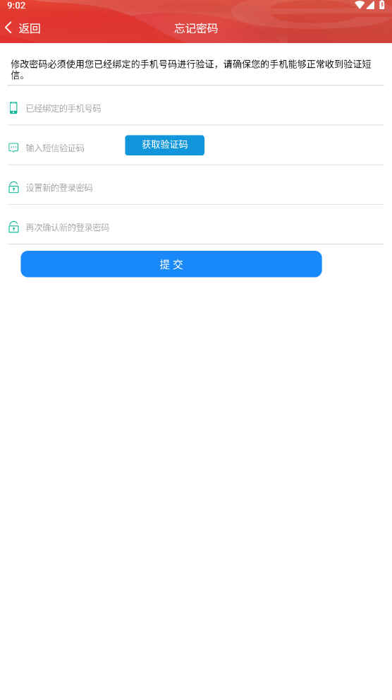 2、输入手机号填写验证码重新设置新密码即可