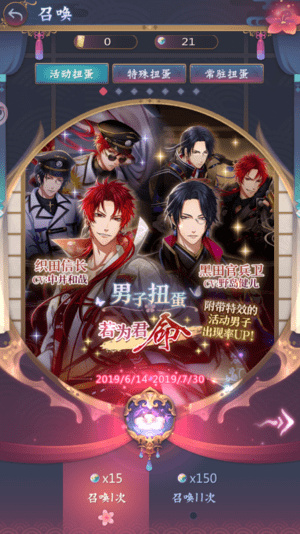 2、限时:日常活动及限时活动;日常活动一般以一个星期为周期,轮流开放;限时活动,在指定时间内举办的活动,可通过活动获得限定男子及各类材料(注:活动错过也不要担心,一般后面会有再次复刻,请各位尽量收集喜爱的男子吧)