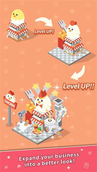 Foodpia闲置餐厅手游终于开张营业啦,欢迎各位老板的到来哦!同时其也是一款以小鸡为主角设定打造的餐厅模拟经营类小游戏,不仅采用时下最经典卡通效果画面呈现,整体画风、人物、场景精致细腻、玩法轻松自由,以及提供了10+小鸡主题餐厅和21个美丽的世界地图等你来解锁,而且游戏内容有趣,操作简单,在这里你将化身成为刚刚起步的餐厅老板,不但可以凭借自己的喜好添置桌椅、厨房设施进行装扮打造出个性的店面,以及及时聘请大厨、餐厅员工,收集购买各种食材为餐厅的发展打下坚实的基础,以此提升餐厅的客流量,提高餐厅的销售利润之外。同时你也还可以利用金币来不断升级餐厅建筑等级、解锁新外观、升级厨房设备、包括去其他的城市学习和收集菜谱的碎片,解锁新品菜单食物、打开新的分支店铺,扩大你的经营规模、赚取你的声誉,从而创建属于你的餐厅帝国哦。另外小游戏中还有着独特的挂机系统,让你从此解放双手,就算是离线了也能躺着有收益,感兴趣的小伙伴可以下载体验一下哦。