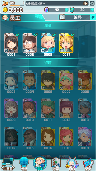 5、在员工界面可以查看当前雇员以及待聘的人员,在此还可以为自己员工进行升级。