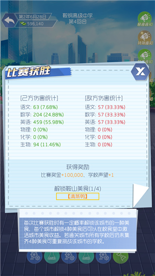 6、比赛获胜之后可以获得比赛奖金+1000000,学校声望+1,还能解锁鞍山美食“清蒸鸭”。
