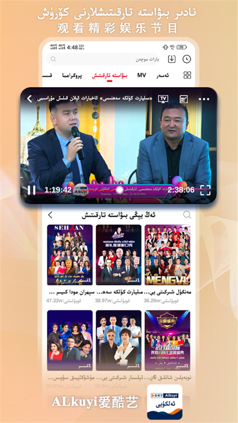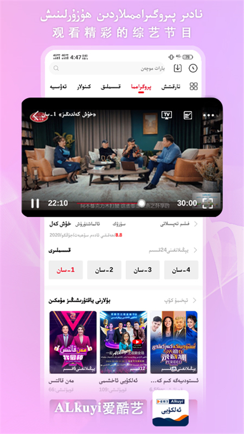 Alkuyi爱酷艺官方版是正能量维吾尔语视频客户端。爱酷艺平台严格遵守遵守各项法律法规,坚决抵制,杜绝不良信息,始终坚持正确舆论导向,积极弘扬社会主义核心价值观,是一款专业,正规,安全,可靠的维吾尔语视频客户端。爱酷艺(维吾尔语视频客户端)以新疆爱酷艺文化传媒有限公司开发的爱酷艺网为基础,跟爱酷艺网同步发布内容,是新疆少数民族用户传播正能量、发布爱酷艺原创视频为目的开发的, Alkuyi影视平台里的所有影视剧是通过专业的译制团队进行翻译和制作,通过严格的审核制度进行三审三查,为用户提供优质的译制电影、电视剧及各类本地娱乐节目。