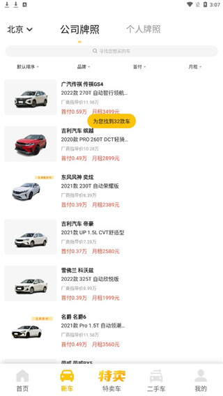 3、点击新车,这里可以看到月租和首付多少钱;