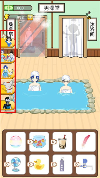 4、进入澡堂后,点击屏幕左侧可选择不同的服务项目、和不同的道具来体验