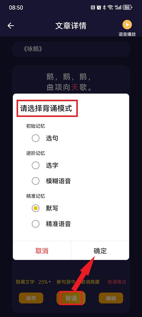 熟悉好文章之后用户就可以点击下方的“背诵”按钮,选择好背诵模式点击确定即可。