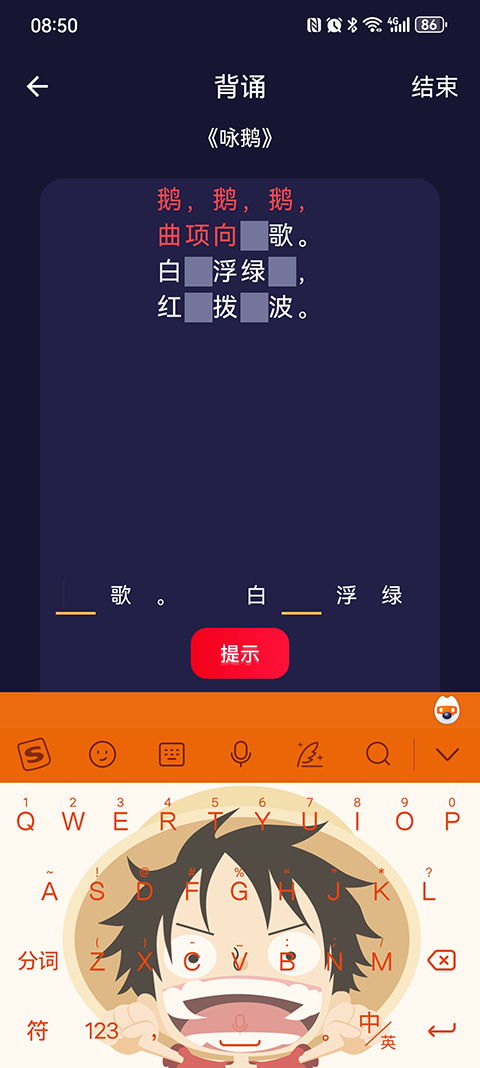之后用户就可以开始背诵啦,在不知道的时候可以点击下方“提示”查看部分提示。