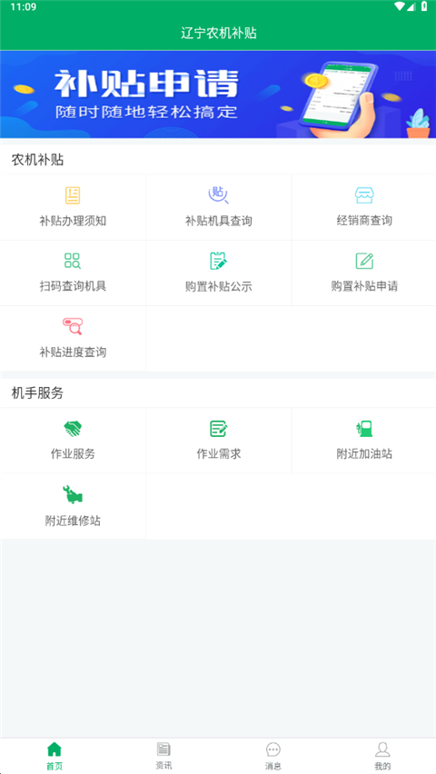 除了补贴办理,App还为农机手提供了很多实用服务,包括作业服务、作业需求、附近加油站和维修站的位置等信息。底部菜单有首页、资讯、消息和个人中心功能,方便用户随时查看最新政策或处理个人事务。