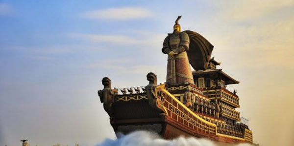 以汉代楼船形制修建,由汉武帝立像、文臣武将、兵勇车马组成,辅以汉代楼船、八方力士。整个雕塑高33.2米,寓意着汉武帝时期的昆明池面积332顷;汉武帝立像高14.1米,寓意着汉武帝公元前141年登基;楼船长54米,寓意着汉武帝在位54周年。凭此一角,足以展现汉武帝的雄才伟略和文治武功,西汉因此也成为了当时世界上最强大,最发达的国家,汉武帝所统治的西汉时期也是我国历史上第一次出现鼎盛局面的封建王朝。如此气魄宏伟的汉武帝立像立于此也寓意着他仍在守护着这一方乐土。