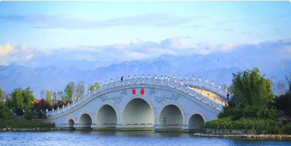 传说中每年农历七月初七会有喜鹊在银河上架起桥梁,让牛郎和织女得以相会,故称作鹊桥。整个鹊桥由海棠环绕装扮,桥身通体洁白,由汉白玉制成,每个桥墩上都有一个展翅欲飞的喜鹊。我们眼前的鹊桥长77米,有7个桥洞,在鹊桥上还有77节台阶,52对喜鹊,“52”寓意着“520”我爱你的意思,在鹊桥上行走还有一个讲究,就是说您可以走7步,或者7的倍数,14步,21步,这样就寓意着您和您的爱人爱情美满,婚姻长久。连接鹊桥的两条长廊分别叫“长相思”和“白首行”,也是对爱情婚姻的一种祝福。