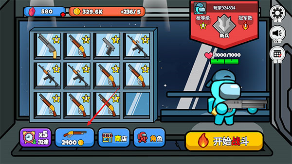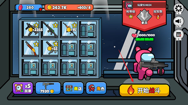1、首先进入游戏后先购买武器进行合成升级;