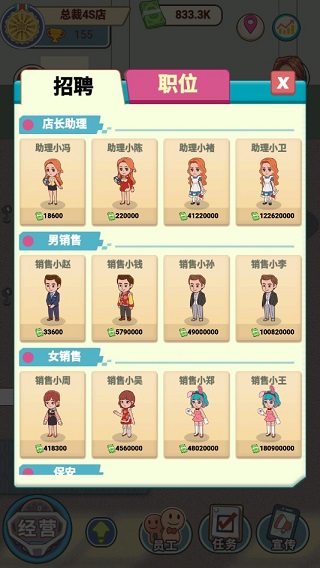 随着店内设施和客人的增加,雇佣员工就成为了你重要的工作,这样既可提升4S点的销售规模,而且还能为你减轻店里的负担。打开“员工”菜单,先为店里雇一位助手帮你一起下单吧。
