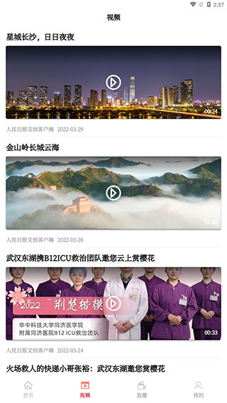 2、软件还有着专门的【视频】页面,这里显示的短视频包含了城市宣传、景色欣赏、积极正向等内容。