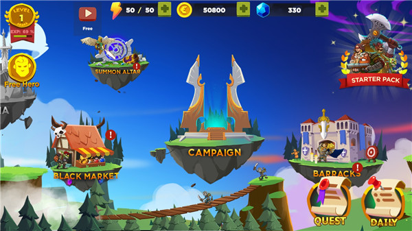1、50个具有挑战性的关卡,召唤你的英雄,让他们去帮你来防御敌人对你的各种攻击