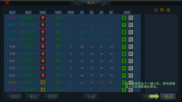 6、点击出征的话,则会进入到编组界面,点击右下角的一键小队可以快速完成编组。
