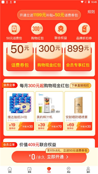 4、进入特权,这里有50元话费包、购物红包、联合权益、品牌折扣券等着用户领取,除此之外,还有很多功能等着用户自己体验!