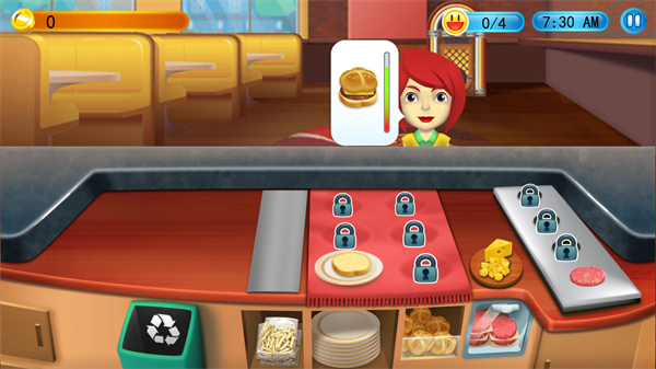 2、你需要亲自为顾客服务。每个顾客都有不同的口味,需要根据顾客的口味做不同的汉堡,并用这些钱来装饰自己的汉堡店。