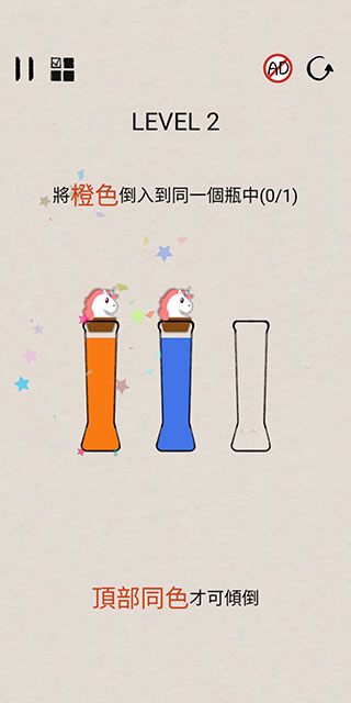 4、如果是多个瓶子,顶部同色才可倾倒。