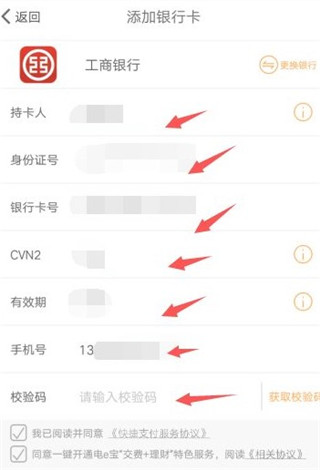 5、然后会出现银行支付的页面,若是银行还未添加,那就根据图中的尖头一步一步添加银行卡,手机号,验证码,然后点击提交,会出现确认界面,看图中,若是忘记密码了,就点击忘记密码,然后重置。