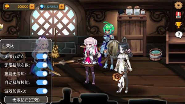 地下城与公主2高级版内置修改器版,游戏内置作弊菜单,修改无限移动点、无限血量、无限行动点、无限技能次数、技能无冷却、自动释放技能、游戏加速三倍以及无限钻石等,玩家可以用无限钻石购买无限金币,在商店中解锁各种装备和道具!