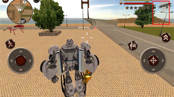 操作很简单,左边移动跑步,右边攻击变身跳跃,变形成汽车的时候还能飙车,听起来就很酷炫!任务就是保护世界和平,对抗邪恶机器人,剧情挺有意思的,而且还有好多任务可以解锁探索。武器装备也很多样化,每种都有不同的射击体验,打中要害特别刺激。
