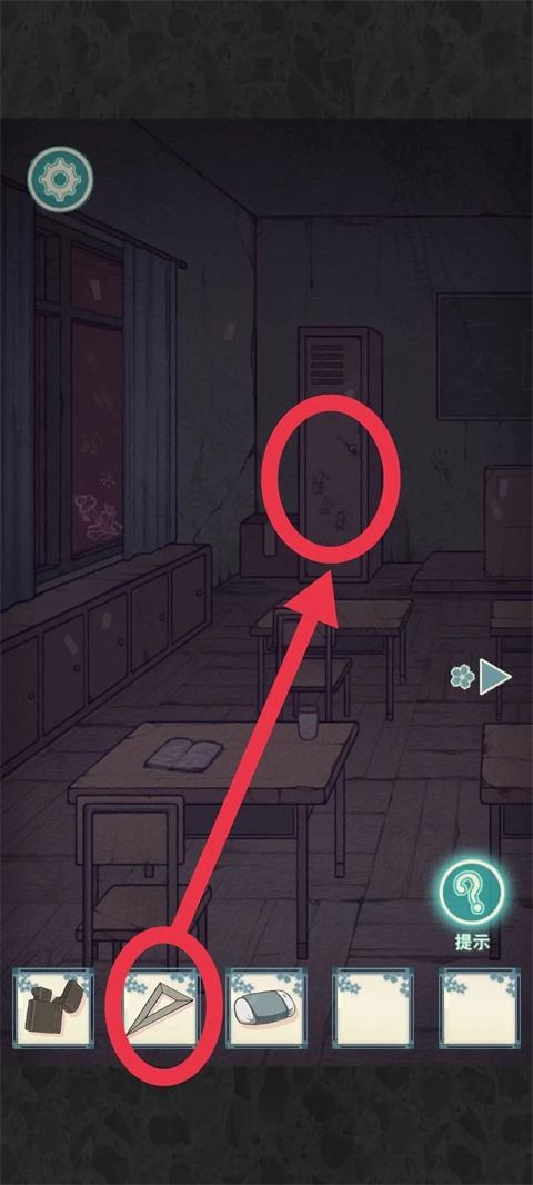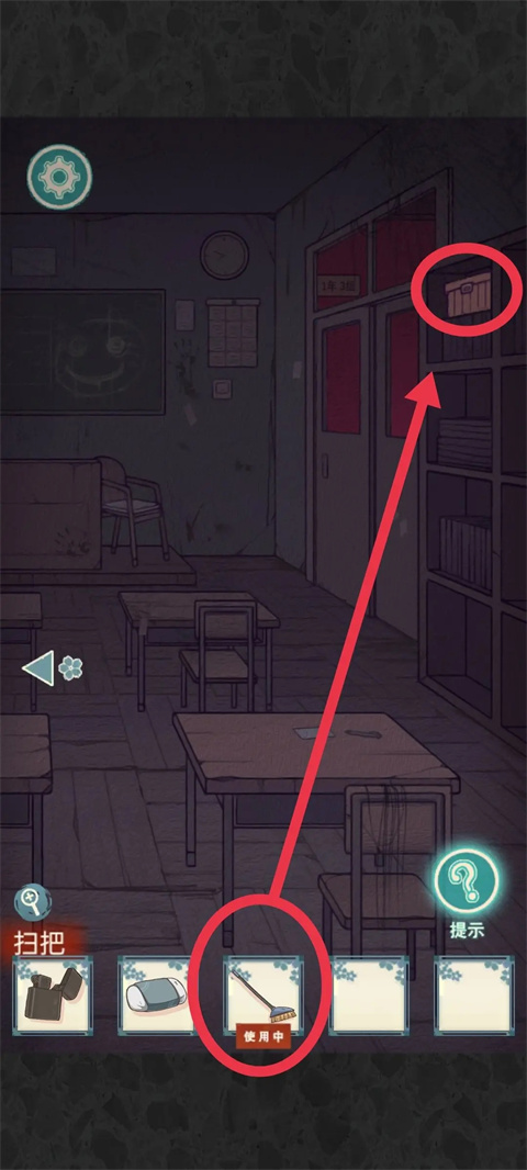 教室(右)使用扫把将高处的箱子弄下来,点击箱子玩个小游戏(很简单连通左下和右上就可以),点击open,拾取剪刀