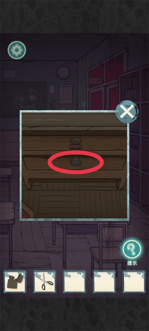 点击讲台边的椅子,使用剪刀,获取输入密码407,获取备用钥匙,使用打开教室门
