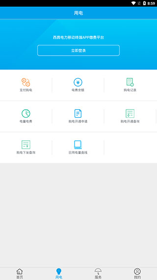 功能包括对周边营业网点的检索和定位、用电申请、购电开通申请、故障报修、业务办理进度跟踪、用户电量电费数据查询、网上购电、停电信息公告等功能。