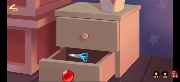 3、将红宝石放入到床头柜底层的凹槽里,打开抽屉后获得“剪刀”。