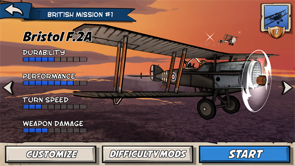 玩家在游戏中将扮演一位一站时期的飞行员,在天空中驾驶各种不同的飞机和敌军进行厮杀,还提供了两种玩法,一种跟着剧情走,完成护航轰炸任务,另外一种则是简单粗暴的1对1PK,考验你的飞机驾驶水平。