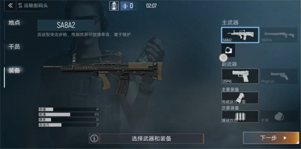 武器配备:SA8A2(突击步枪)、电磁脉冲手雷、爆破炸药。