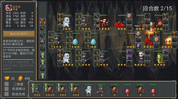 (2)狙杀暴击流。弓箭橙色的狙杀者有着超高的暴击倍率,配合加暴击率的装备可以100%暴击,完全可以打出高两个星级的伤害(高一星是2倍伤害,高两星是4倍伤害,狙杀者天生暴击伤害就有300%),而且弓箭的羁绊还有概率触发连击,如果再集中资源培养做到星级碾压的话,伤害绝对不容小觑,配上追击匕首,基本可以把对面杀个七七八八甚至团灭。当然,缺点也是有的,遇到反伤就比较头疼,要浪费一个装备格子来装暗杀之剑。
