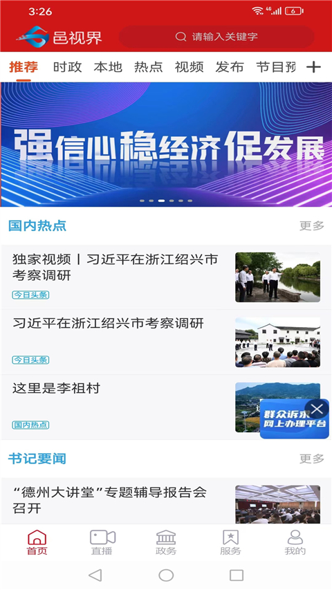 邑视界app是临邑县当地官方专门为临邑当地居民们所打造的新闻资讯类软件,拥有包含政务、生活服务、新闻资讯等内容的版块,能够为当地居民们的生活带来巨大改变。而且软件客户端不单单只拥有临邑本地最权威、最及时准确的新闻信息,还汇聚了很多国内甚至是国际上最新的新闻内容,当地居民们只靠一部手机就能知晓天下大小,相当不错。此外邑视界还有效实现了电视大屏与手机小屏互相联通,将电视直播、视频点播、电台直播、电台点播等内容融汇在一起,让居民们能够有更多的选择的同时也将其打造成了传统主流媒体的新型宣传平台,为服务临邑、推广临邑打造又一处渠道。