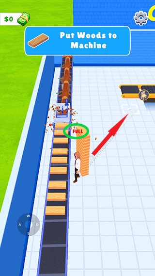 玩家需要控制人物走到最左边的木材生产机器进行木材的搬运,控制人物靠近木材运输带,会自动拾取,拾取到一定数量会出现fall字样,说明拾取数量已满,需要控制人物把木材放到右边制造机器上去。