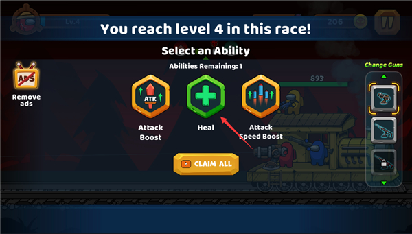 5、成功击败怪物可以获得经验升级你的小火车,并继续选择道具,(选择道具是根据当前的层数决定,例如你击败第2波怪物即可选择两次道具);