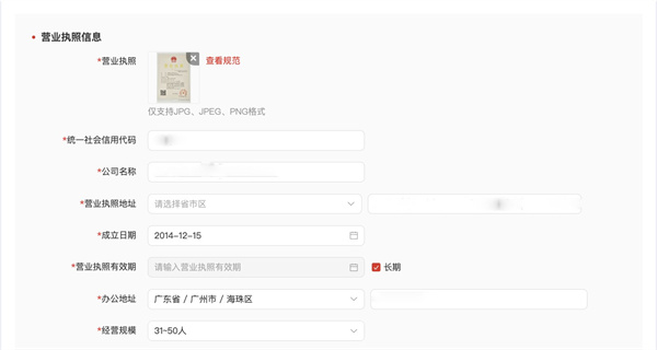 3、根据相关要求上传营业执照以及法定代表人的身份信息。