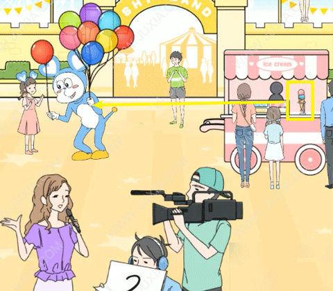 1、在蓝皮鼠手中获取【气球】,使用【气球】将冰淇淋车最右边女子带到天上。