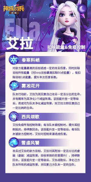 阵容特点:较完备职业抵抗控制队,艾拉自身有免控技能,可以搭配一些抵抗高的或者被控也能继续输出的英雄,这个队伍可用于对战控制能力强的敌方阵容