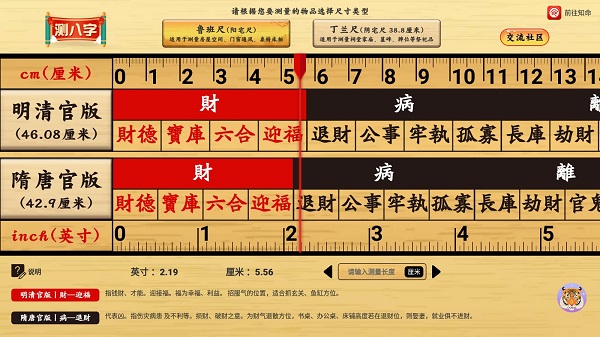 2、尺子选择:可自由切换“鲁班尺”与“丁兰尺”,鲁班尺又称“文公尺”,用于房屋宅邸、器具物品的尺寸测量,丁兰尺多用于家庙祠堂的尺寸测量;