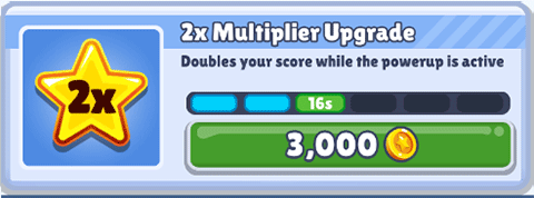 获得双倍得分(2X Multiplier)后,在道具有效时间内,每收集一个游戏币即可获得两倍于原先倍数的得分。