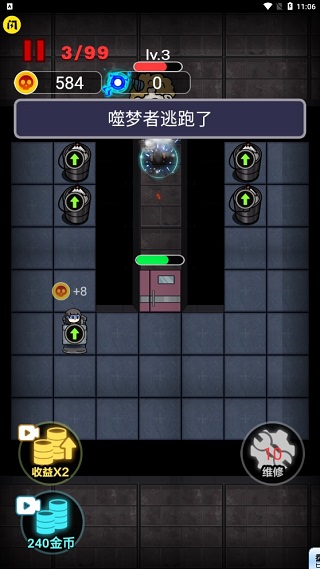 然后第一时间把床的每跳收益升级到+32,此时4个炮塔完全足够守住鬼的攻击。