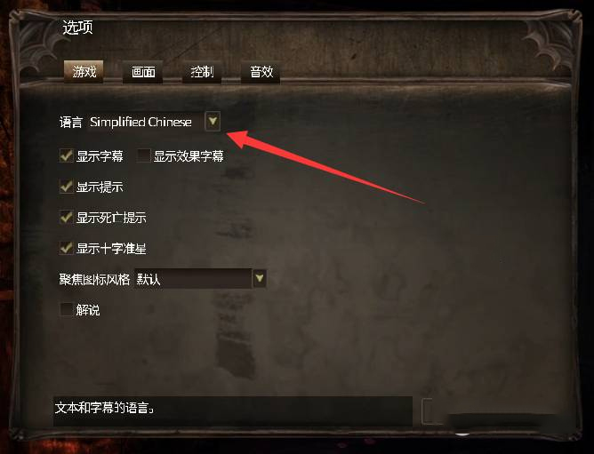 2、在选项中的第一页“游戏”页面中,找到语言,通过下拉菜单选择为simplified chinese(简体中文)即可成功设置。