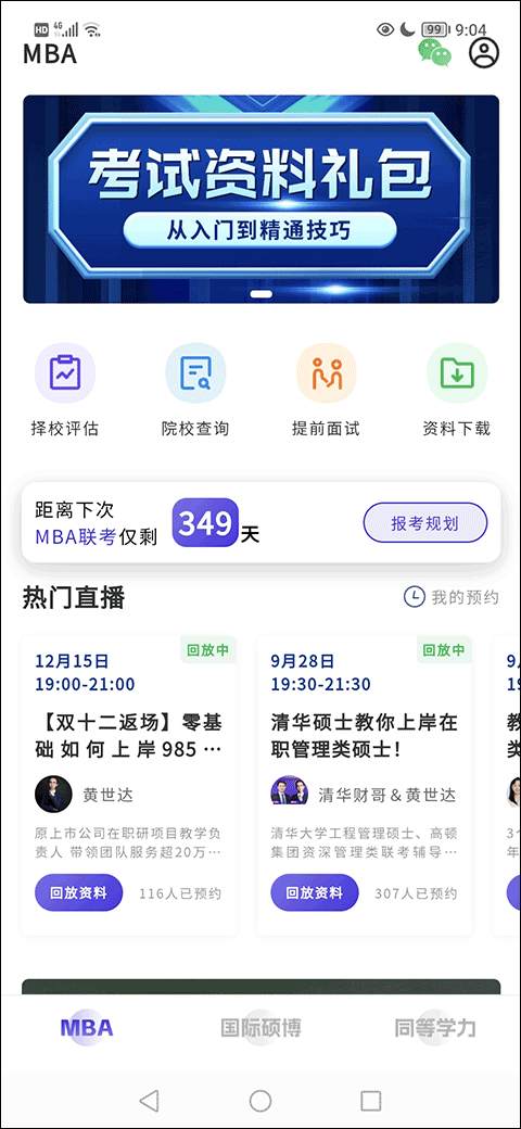 打开软件,同学们可以通过热门直播、课程中心、联考资讯来了解考试的各项要求和重点。同时为了让大家能够在平台上快捷的浏览到自己有用的信息,高顿MBA联考考试题库的择校评估、院校查询、提前面试、资料下载都能够为学子们提供最基本的考试查询;同学们还能在这里学习国际硕博、同等学力的相关内容,希望自己成绩拔高、希望自己能够获得进步的同学们就快来下载这款软件吧。